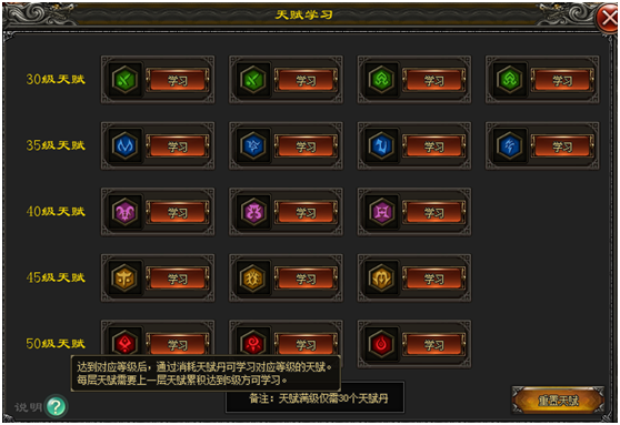 装备界面可学习天赋,来提升自己的实力,每层天赋需要上一层天赋累计学习达到5级方可学习